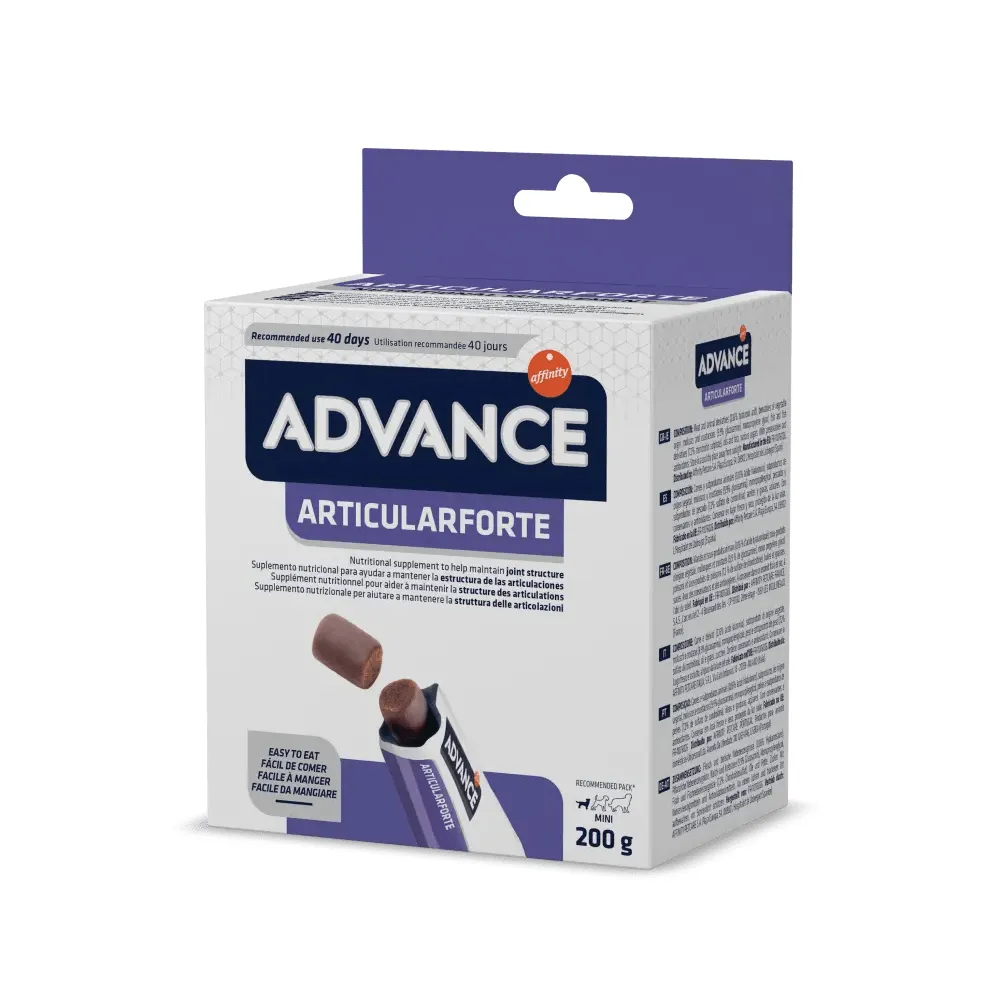 Advance ArticularForte Suplemento para Perros es un suplemento articular que protege las articulaciones, ayudando a frenar su desgaste. Además, ayuda a reforzar los cartílagos y mejora la movilidad. Es muy fácil de administrar gracias a su gran sabor.