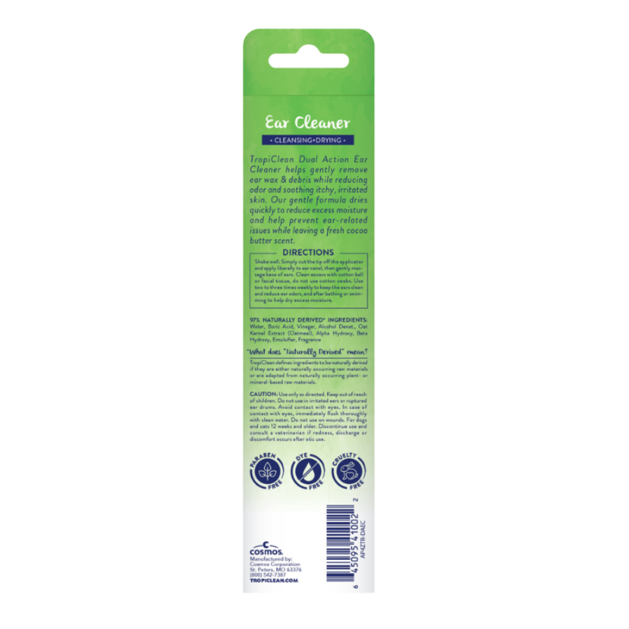 Las soluciones de limpieza de oídos funcionan mejor cuando se usan después de bañarse o nadar para ayudar a eliminar el agua atrapada en los oídos, lo que puede provocar infecciones. Los productos para mascotas TropiClean son libres de crueldad.